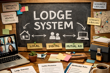 The Lodge system is a structured but flexible framework for local groups to meet, discuss, coordinate, and act together under shared principles while maintaining local autonomy.